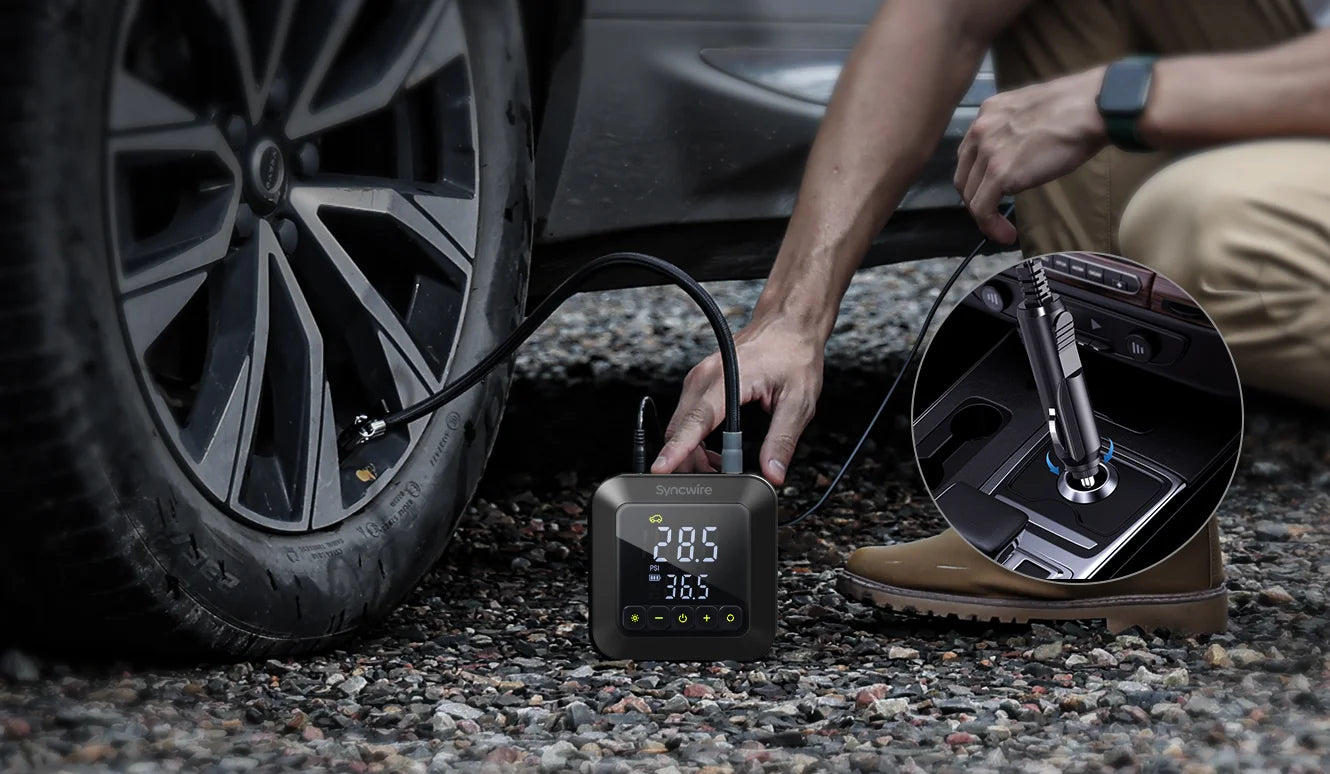 Il gonfiatore per pneumatici Syncwire è versatile e può essere utilizzato su pneumatici di auto, biciclette, motociclette, attrezzature sportive e altro ancora. Viene fornito con vari adattatori per ugelli per soddisfare diverse esigenze.