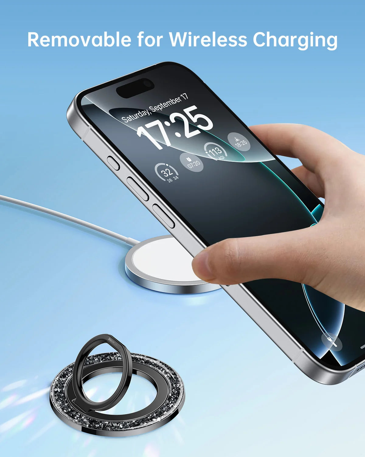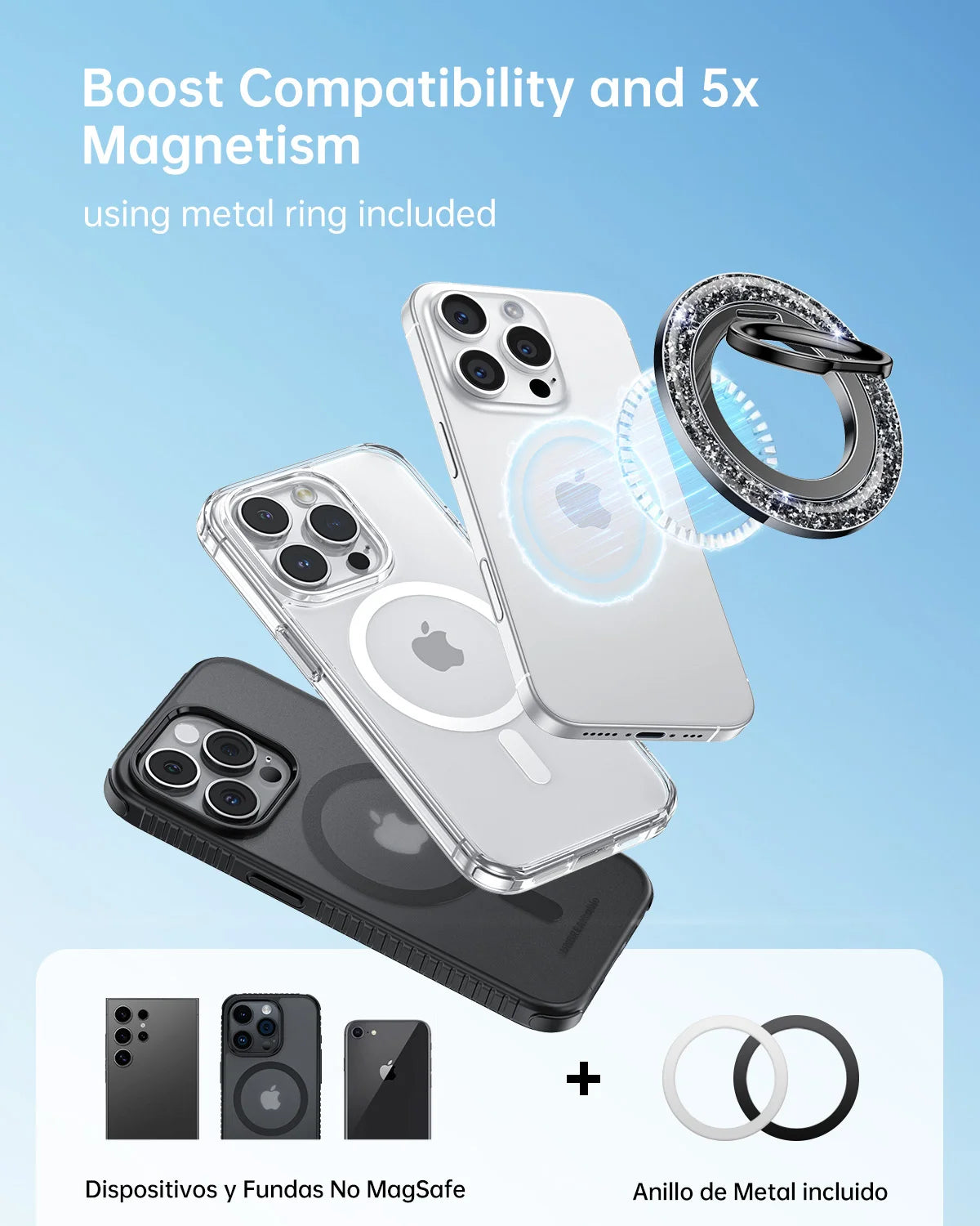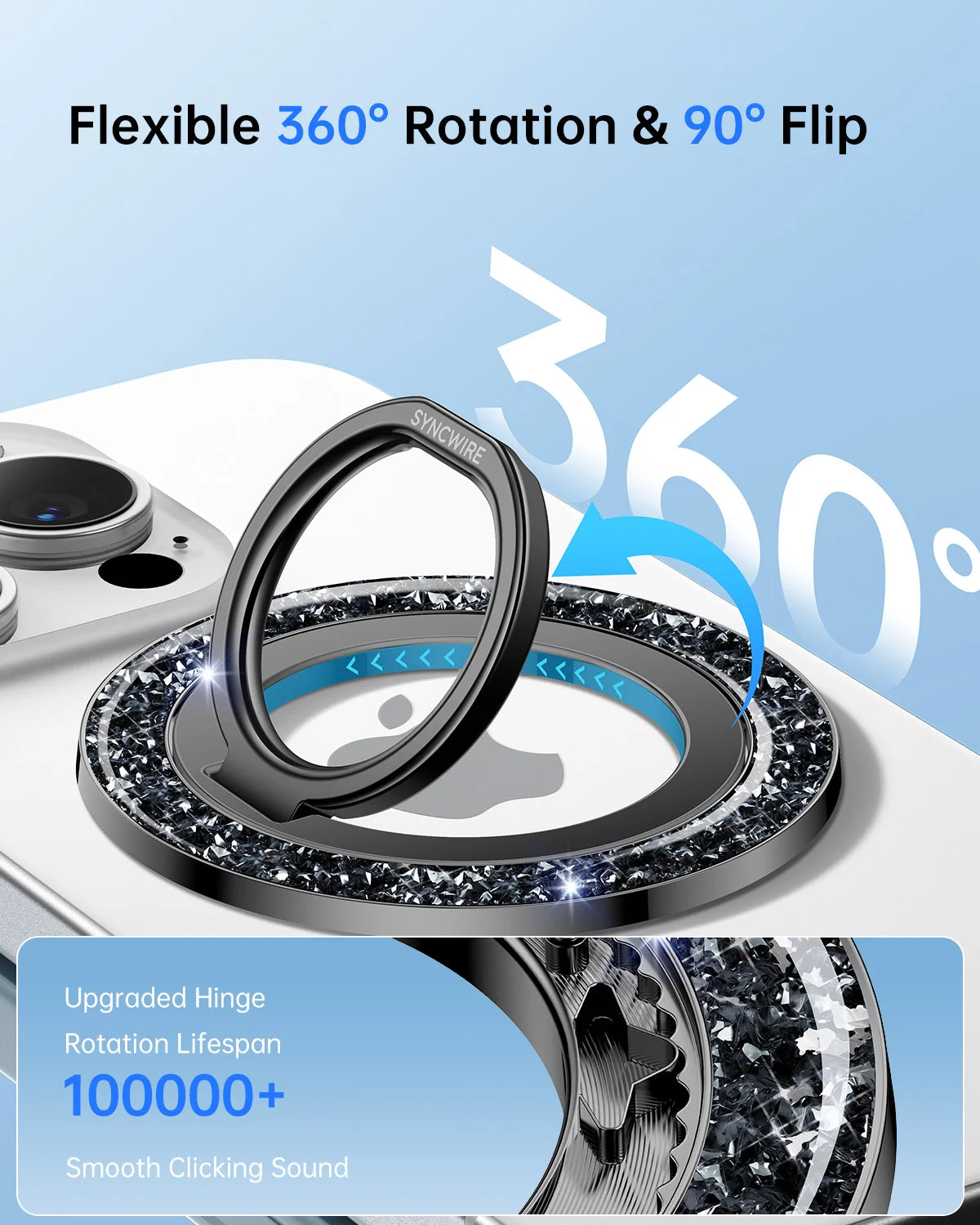 • Magnetico super forte: Il supporto magnetico ad anello per telefono Syncwire Glitter è realizzato con magneti N55 NdFeB, che offrono una forza magnetica eccezionale. Puoi fissare saldamente il tuo telefono al supporto magnetico ad anello MagSafe con un solo dito, sperimentando una presa salda che resiste a scosse o movimenti. La forza magnetica può essere aumentata di 5 volte se utilizzata con l'anello metallico in dotazione.